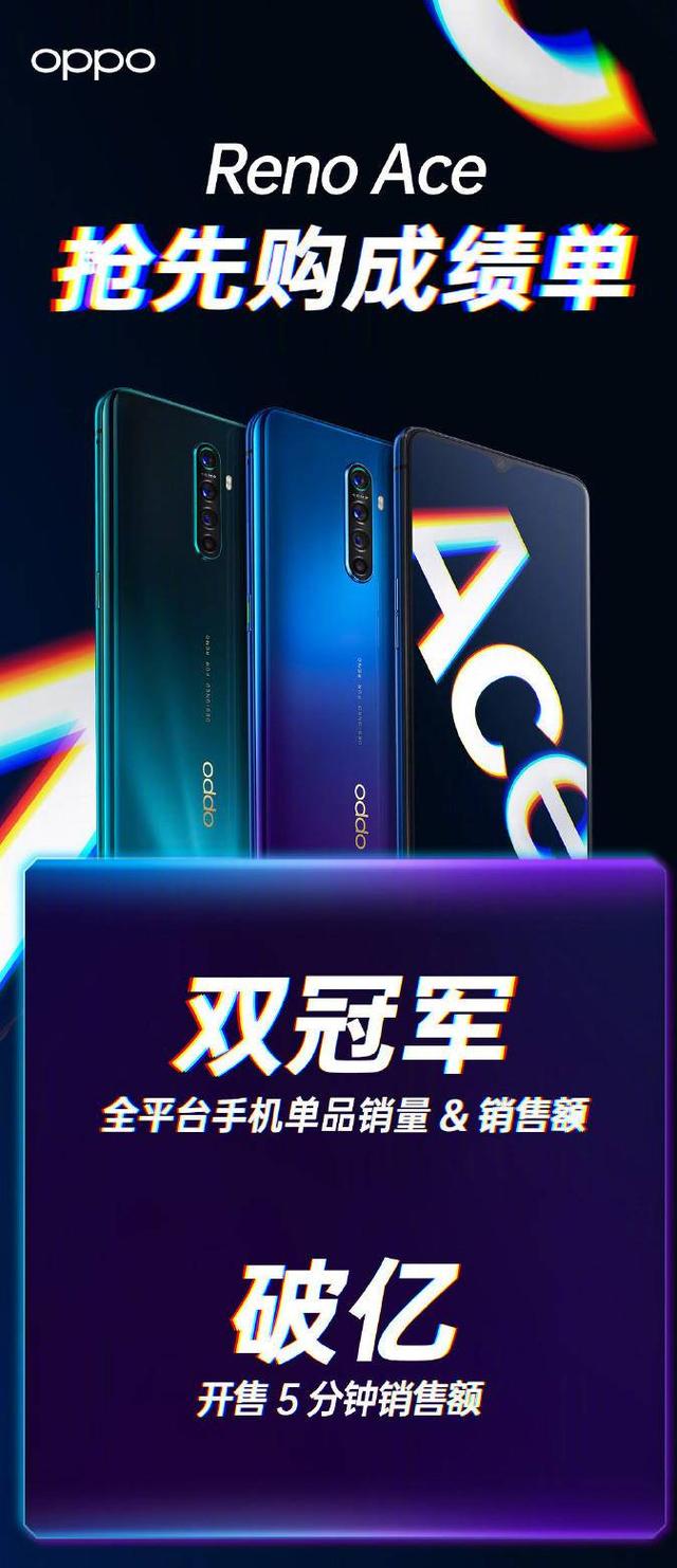 得益于强大的配置,Reno Ace发布后口碑反响一直不错。10月17日,Reno Ace发起首轮抢先购活动,开售5分钟销额便破亿,5万现货当天售罄,成功赢得全平台手机单品销量和销额双冠军,纵观各电商平台,有关该机的评价也基本都是好评。
